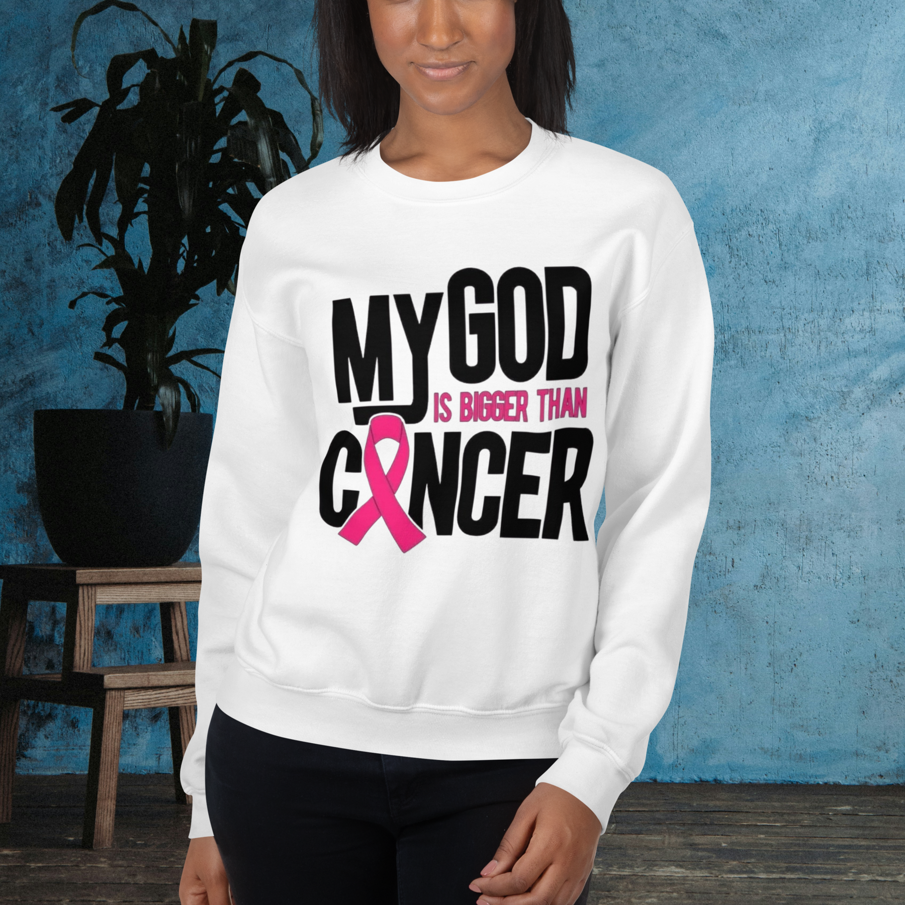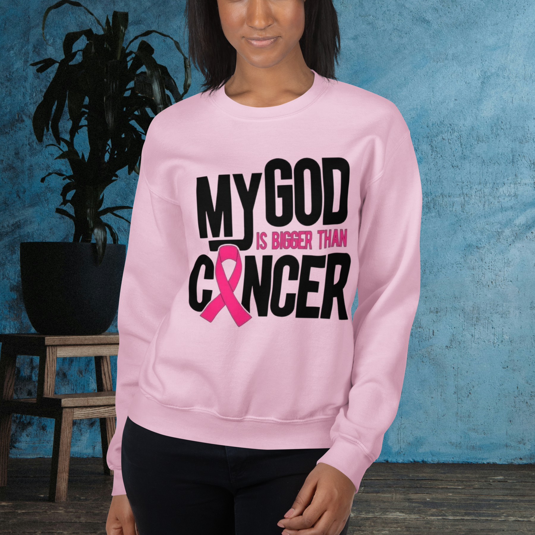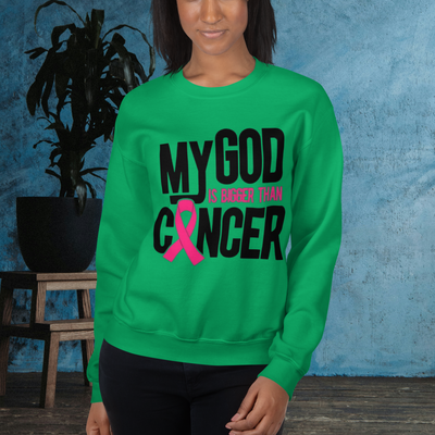 Show your faith and resilience with this inspiring t-shirt. The bold, impactful design features the message "MY GOD IS BIGGER THAN CANCER" in striking black and pink text, including the iconic pink ribbon for breast cancer awareness.