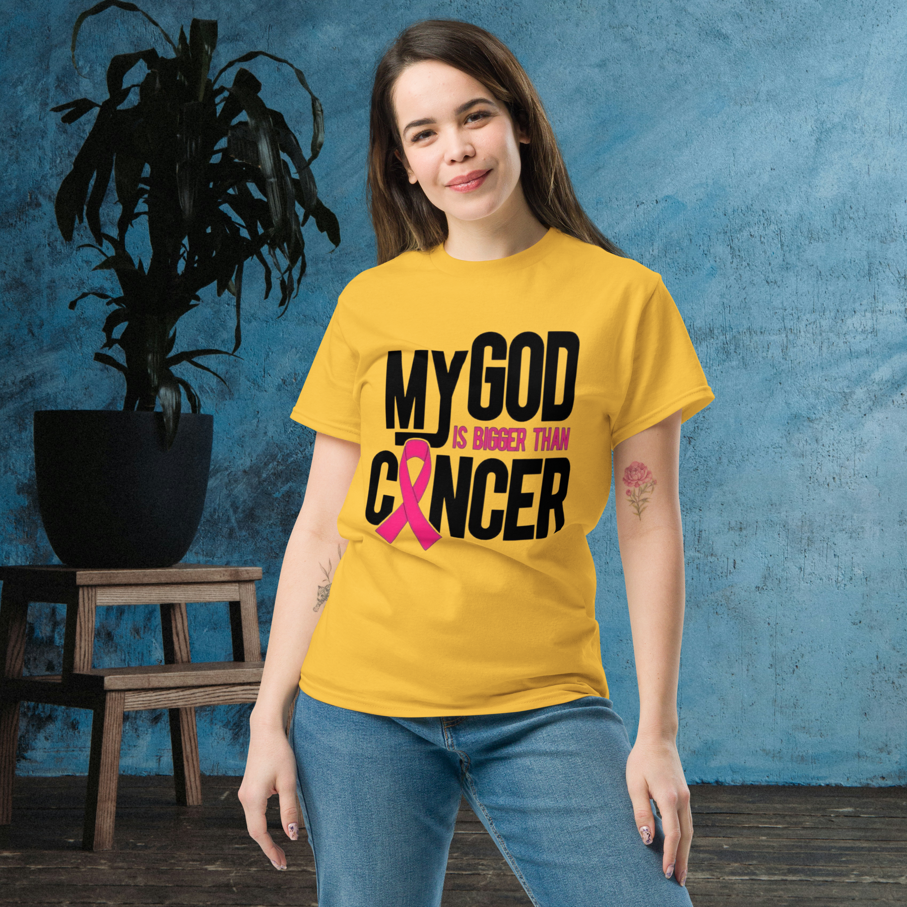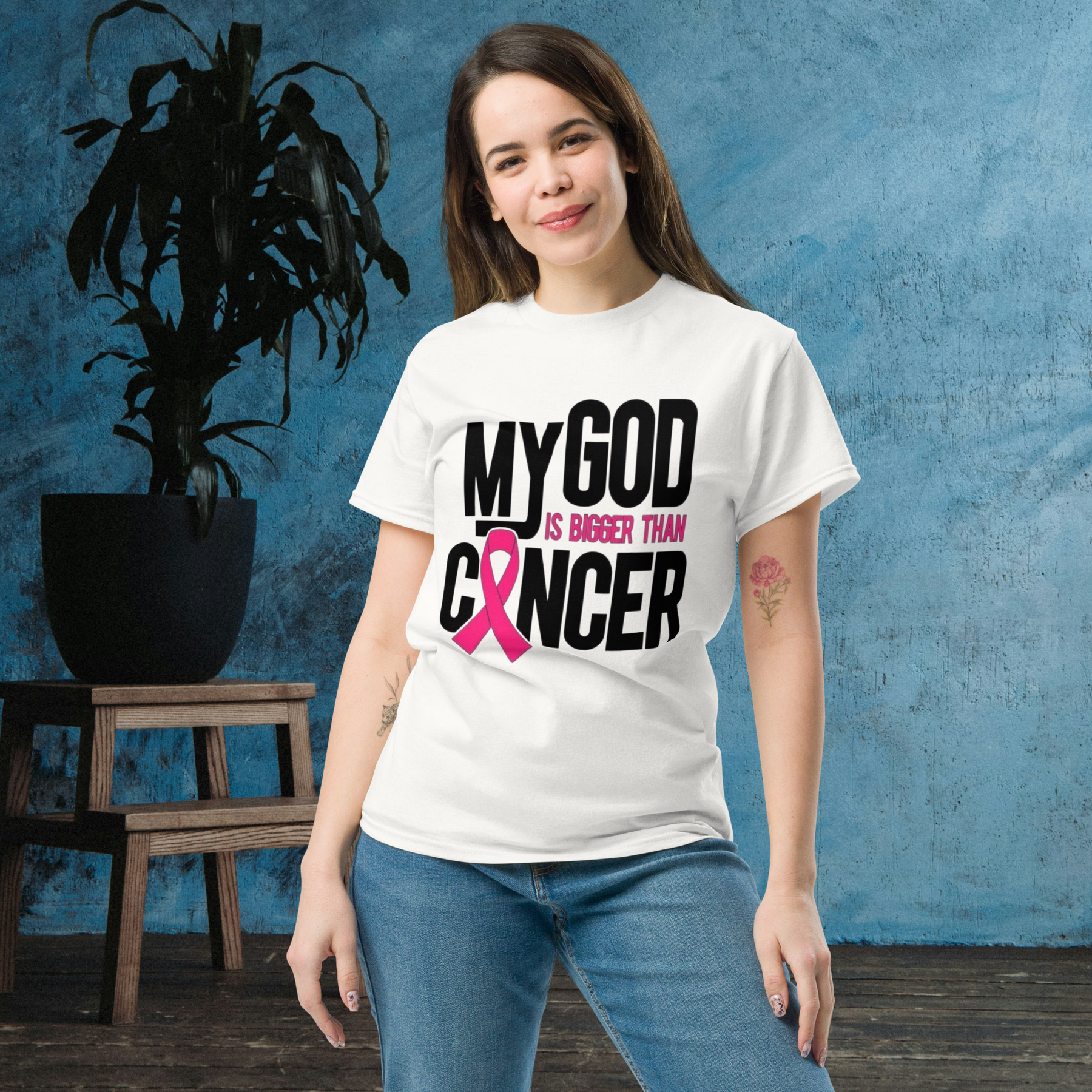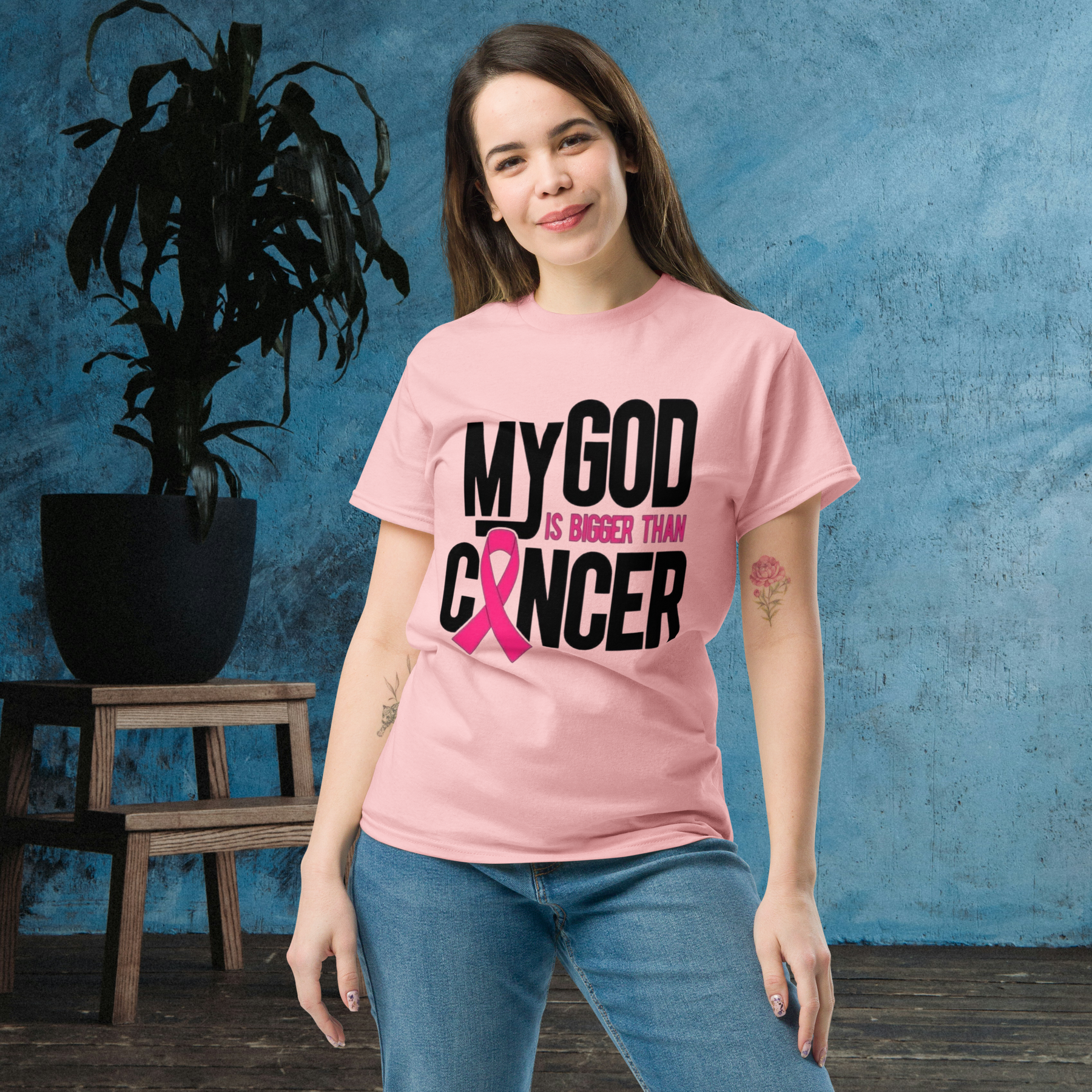 Show your faith and resilience with this inspiring t-shirt. The bold, impactful design features the message "MY GOD IS BIGGER THAN CANCER" in striking black and pink text, including the iconic pink ribbon for breast cancer awareness.